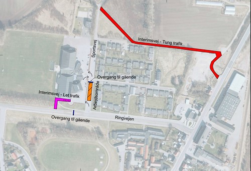 Det er tilmed en mulighed at bruge vores lille ”interimsvej”, som er markeret med pink på kortet og går fra Ringvejen og ind til fritidscenteret.